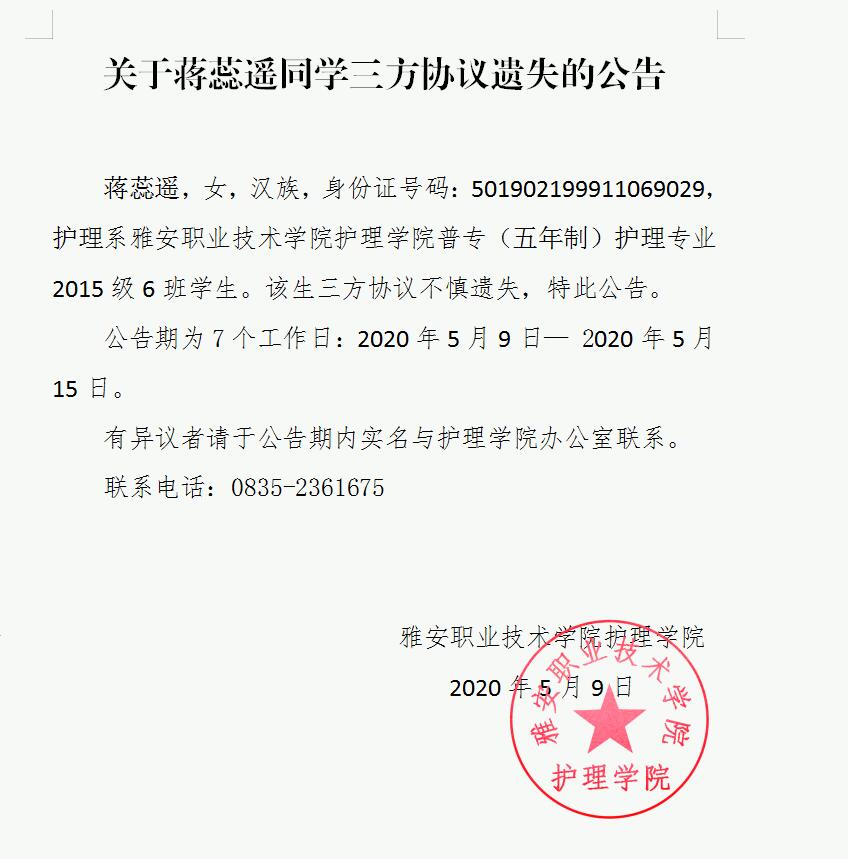 关于蒋蕊遥同学三方协议遗失的公告