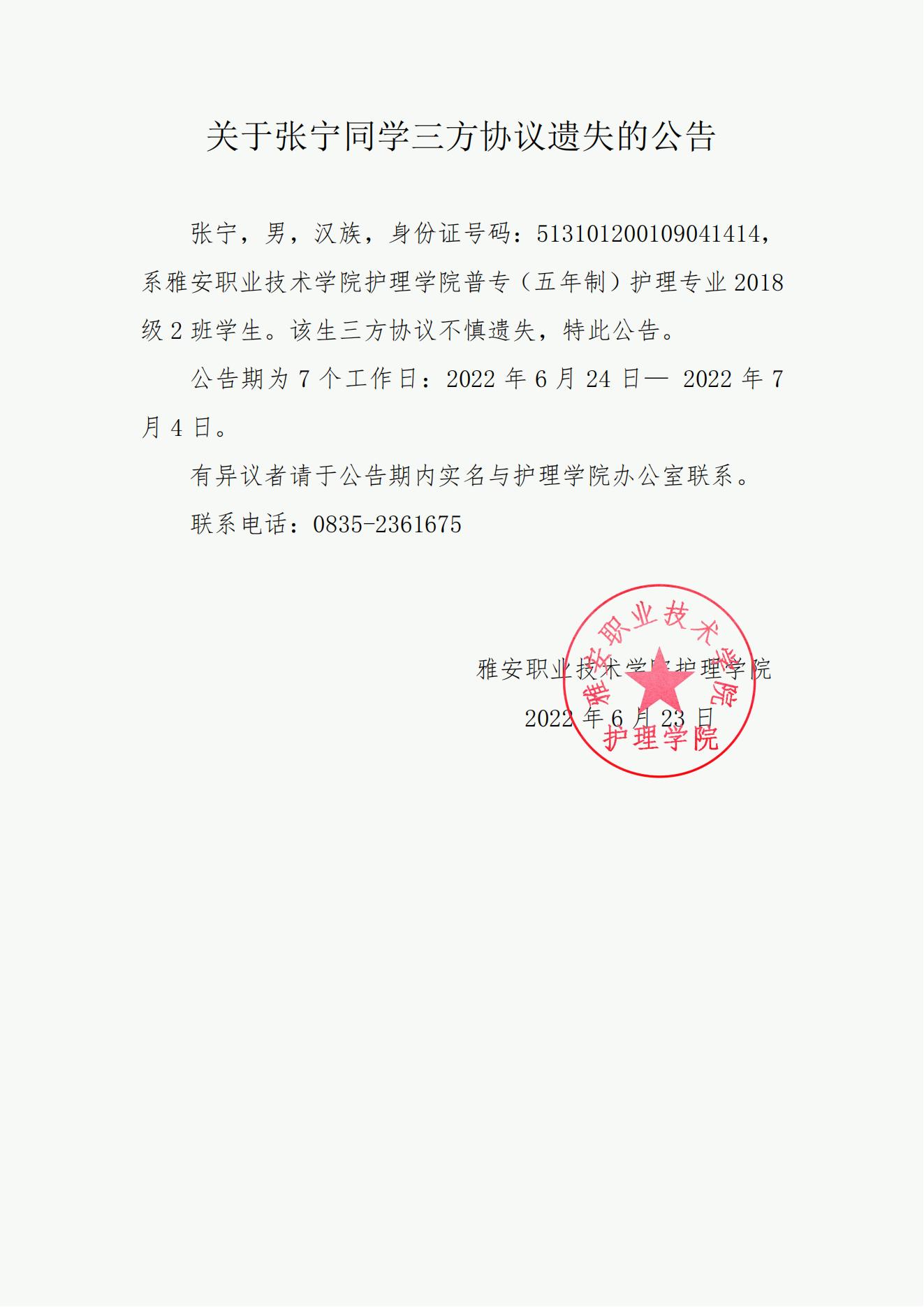 关于张宁同学三方协议遗失的公告