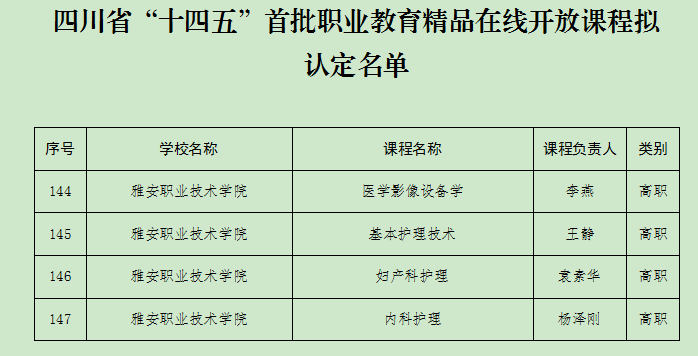 目前,四川省教育厅公示了“十四五”首批职业教育精品在线开放课程认定名单,388vip太阳集团的《基本护理技术》、《内科护理》、《妇产科护理》三门课程被认定为省首批精品在线开放课程。此次共认定了150门课程,其中高职145门,中职5门,公司共有四门课程认定。