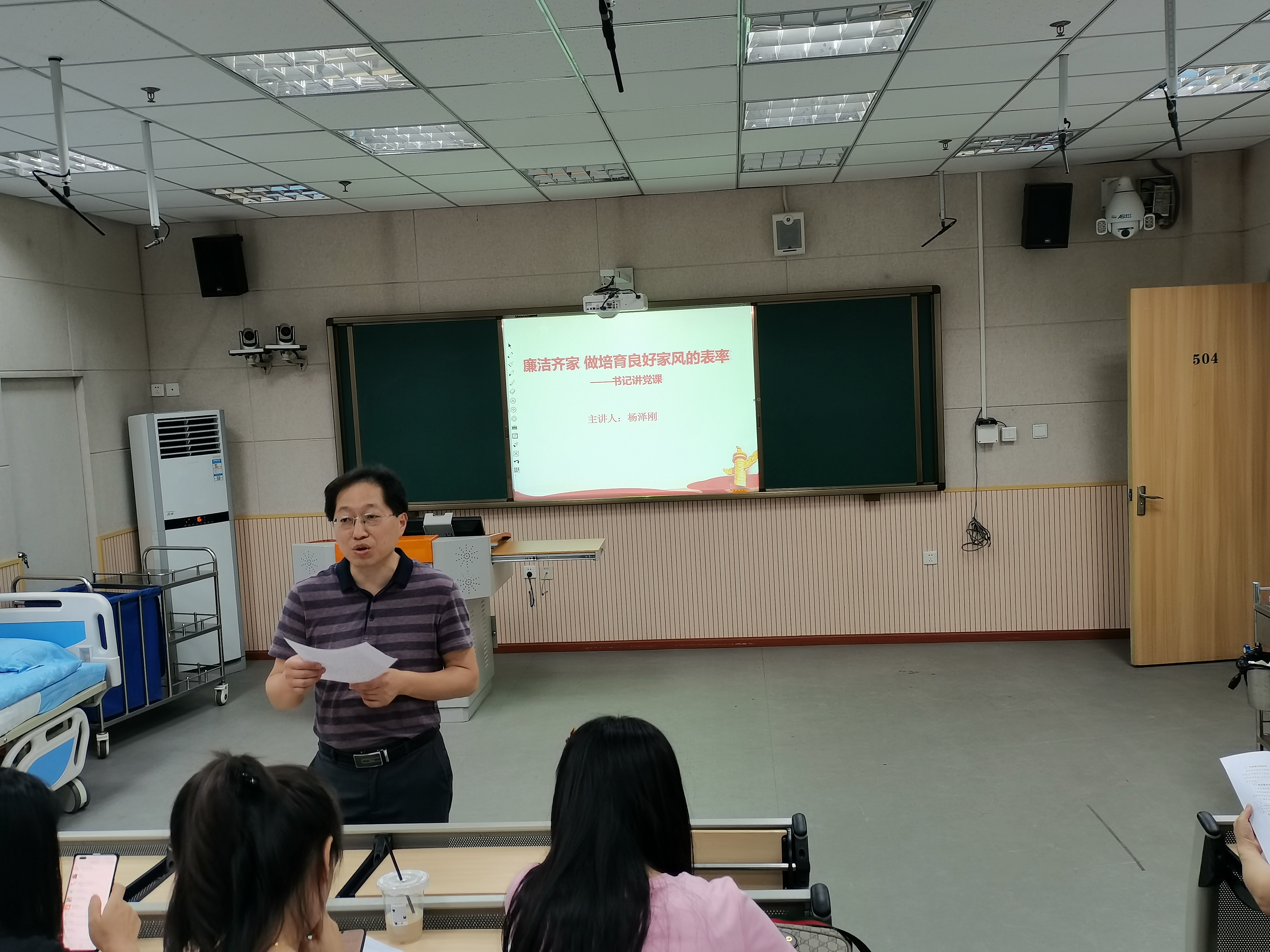 6月21日下午,388vip太阳集团党总支书记杨泽刚在青年路校区实训楼504教室为388vip太阳集团全体教职工开展了主题为《廉洁齐家 做培育良好家风的表率》的专题党课。