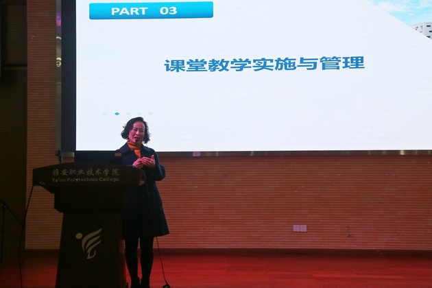 培训会分为两个议程。第一个议程在汇雅厅举行,由李婧副经理主持,王静经理就人才培养方案、教学规范与基本要求、课堂教学实施与管理三个方面进行了解读。着重解读了备课要备教材、备员工、备知识。之后兼职教师分三批轮转式进入第二议程“三个工作坊”的培训,三个工作坊分别设在实训楼504、实训楼506和实训楼606。实训楼504是线上线下混合式教学方法及教学策略运用工作坊,王菠老师就线上教学学习通的使用进行了视频、文字和图片相结合的多维度示范培训。任冬梅老师就课堂上常用教学方法的运用进行了深入浅出的对比讲解。实训楼506是课程教学设计及PPT的制作工作坊,李燕副处长循循善诱的讲解了基于OBE理念下如何进行教学设计。张雪庆副经理通过同一上课内容不同年份的两份不同PPT的制作思路,引导兼职教师要与时俱进、不断更新教育理念,发挥好PPT这个辅助工具的作用。实训楼606是护理专业课程思政教学设计与实施工作坊。许玉贤老师如沐春风般层层递进的展示了如何将“立德树人”的思政元素有机融入课堂教学,达到润物无声全方位培养育人的效果。