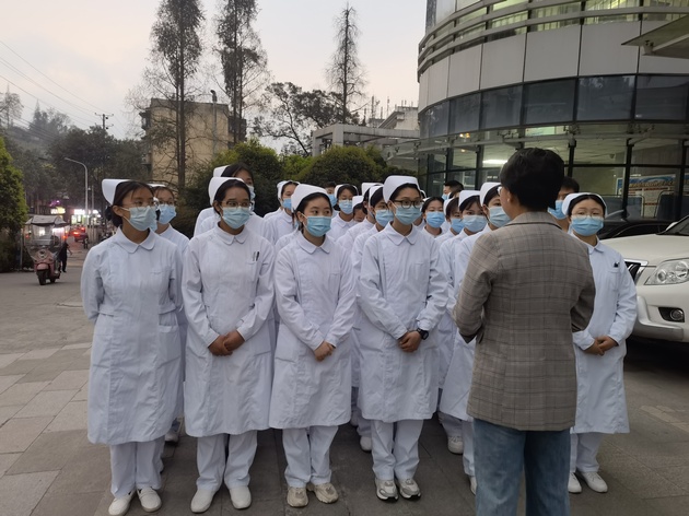当日上午八点,在388vip太阳集团廖林梅老师的带领下,同学们穿戴整齐到达市医院行政楼下集合。市医院护理部副主任周昀霞对公司老师及订单班员工的到来表示了热烈的欢迎,对医院的情况做了详细的介绍,并就临床学习中着装规范、人身财产安全、职业防护等内容提出了要求,最后希望同学们能认真学习,尊敬师长,勤学善思,尽快融入。随后,订单班的成员进行了人员编排,分别进入各个科室。