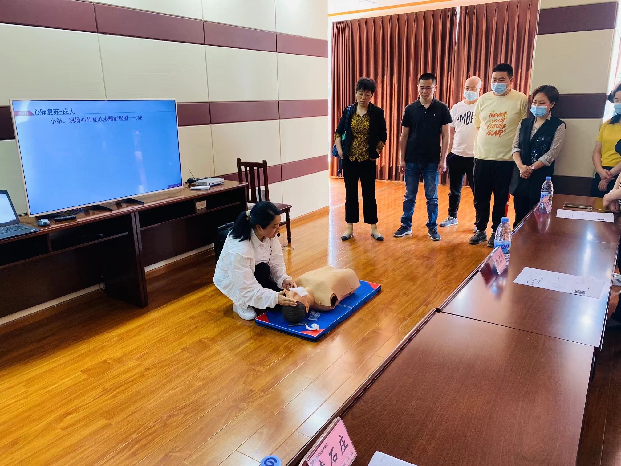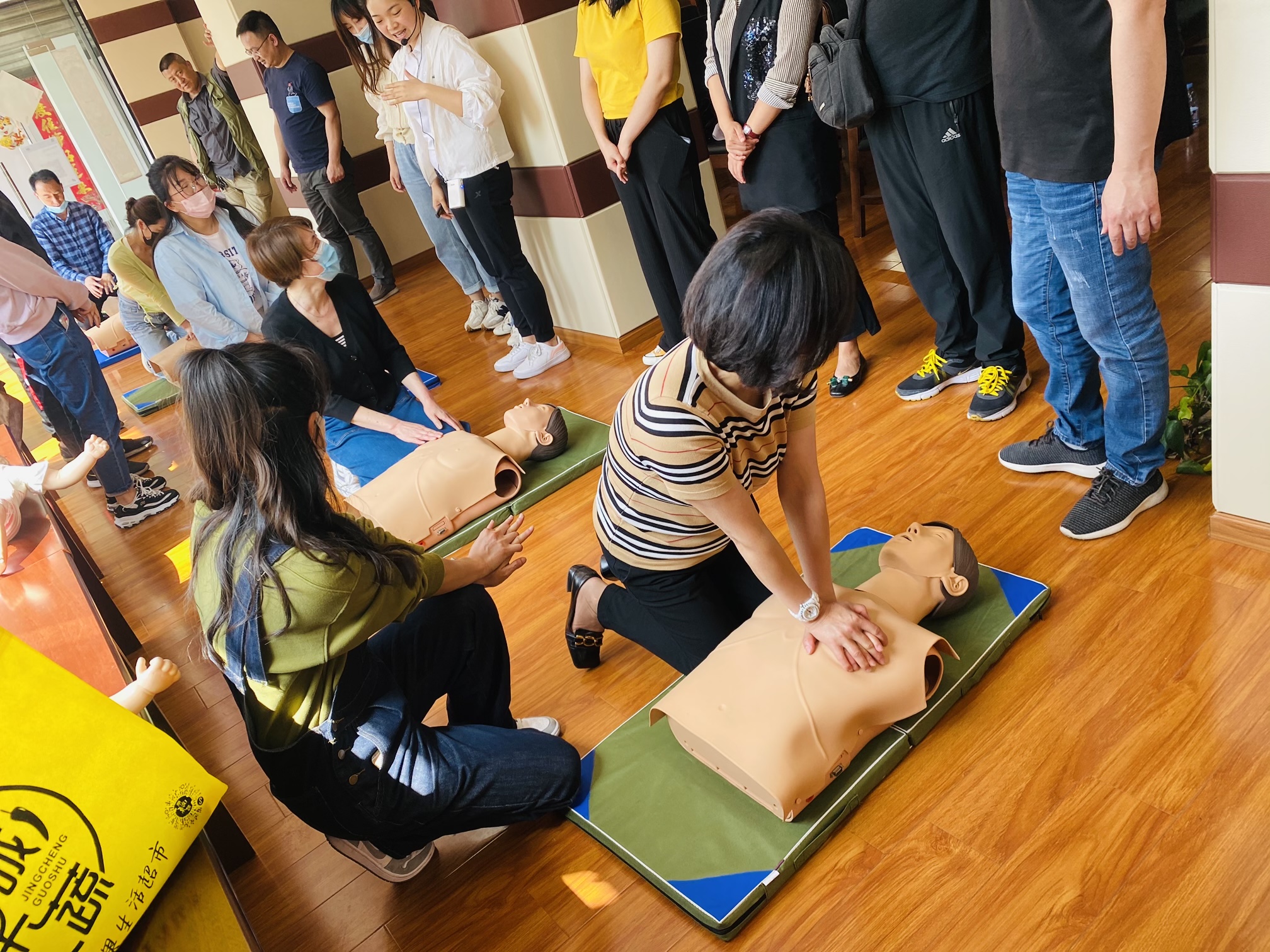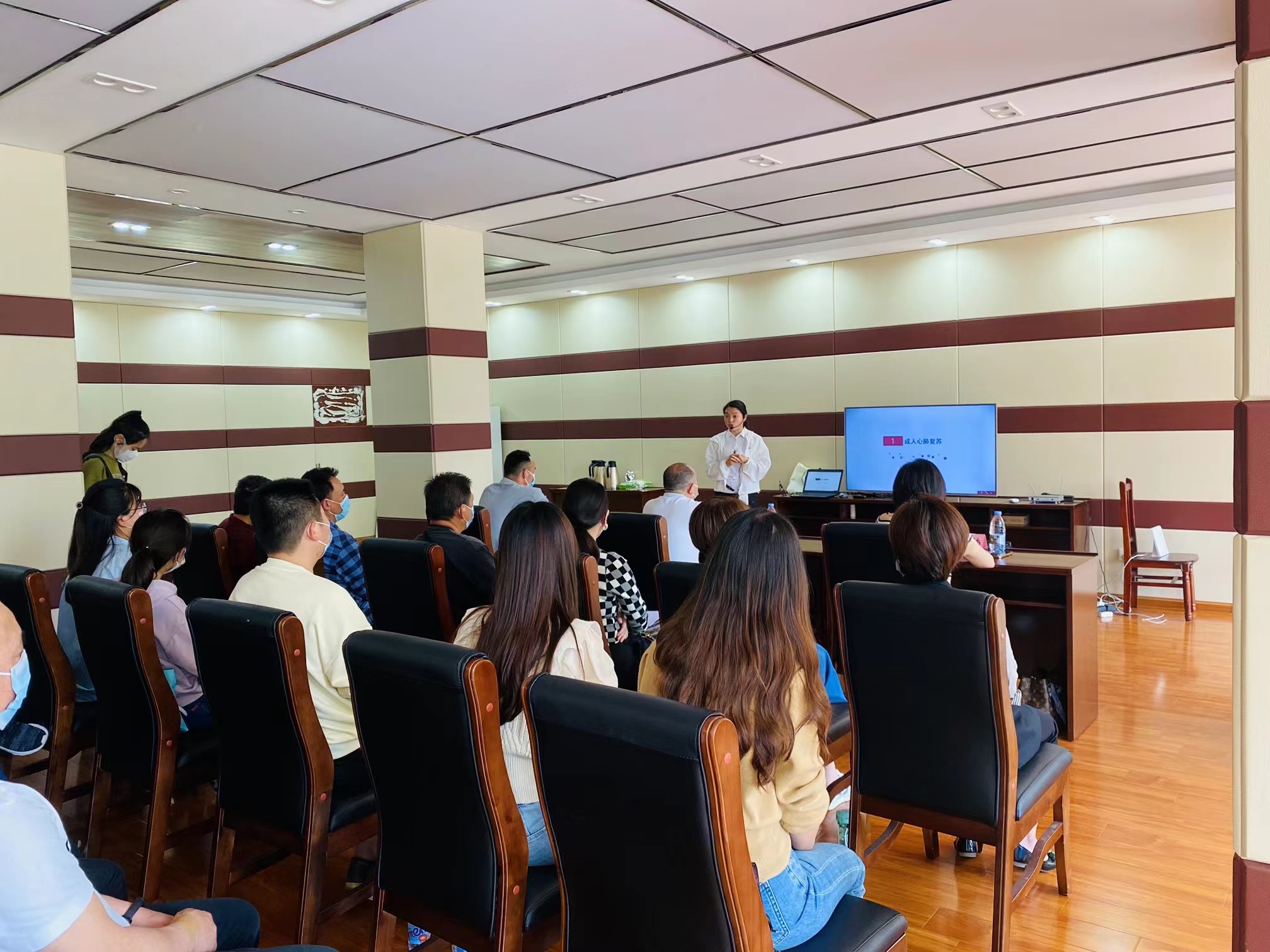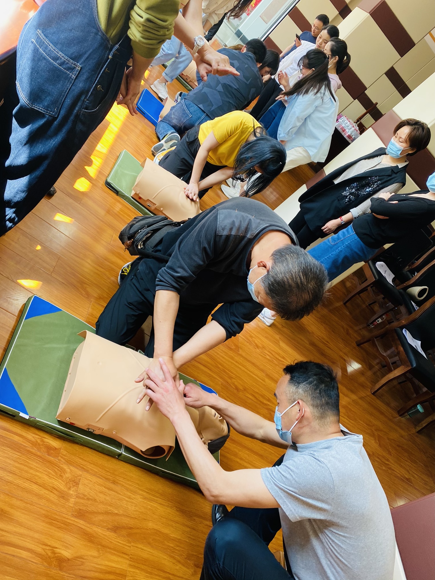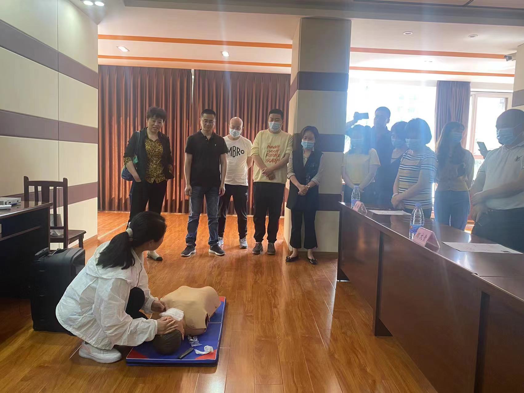 公司急救专家殷显艳老师现场结合案例、视频、图片,用通俗易懂的语言讲解了心肺复苏、自动体外除颤仪和海姆立克急救法的知识要点,采取示范操作、互动教学的形式加深了学员对急救知识及操作技能的理解。参训学员还在殷显艳老师和李爽镜老师的指导下,认真地进行实践操作。