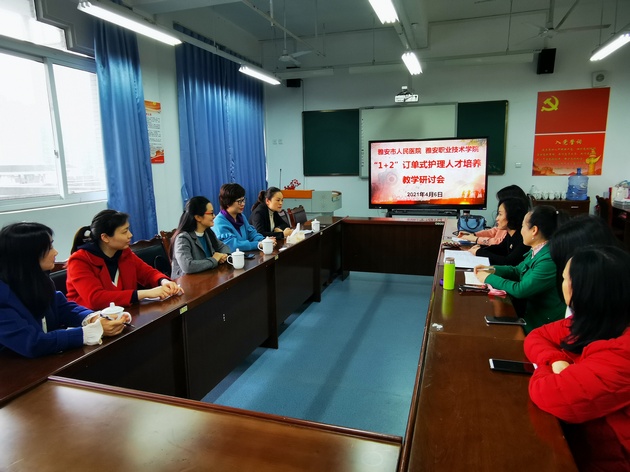 为了深化医教合作,共同培育优秀护理人才,4月6日下午,在实训楼607召开“1+2”订单式护理人才培养方案教学研讨会。雅安市人民医院护理部主任胡盛琳、副主任周昀霞、胸外科护士长刘晓燕,388vip太阳集团经理王静,教研室主任陈俊、张雪庆、许玉贤、黄丹,专业带头人周良燕,骨干教师李婧、邬君芳等参加研讨会。