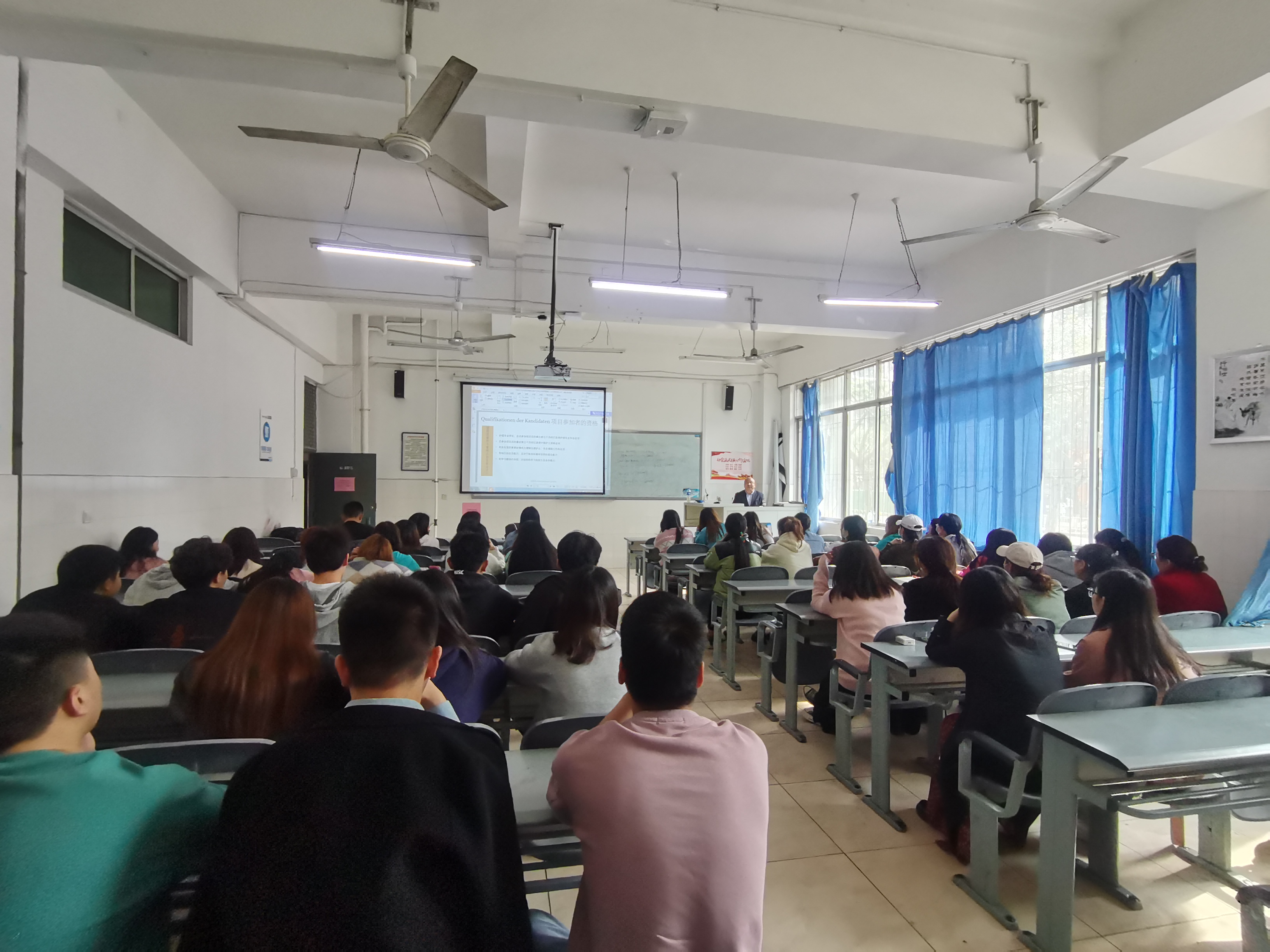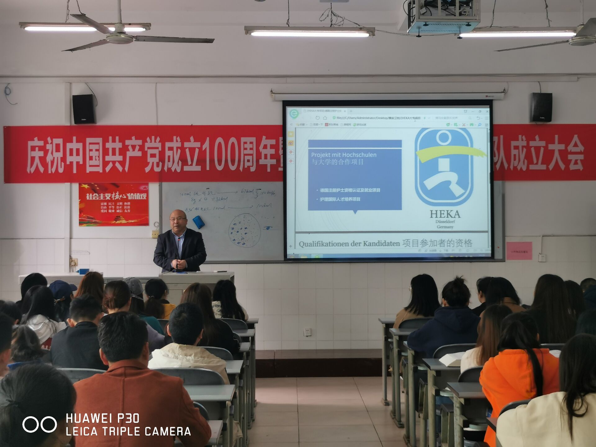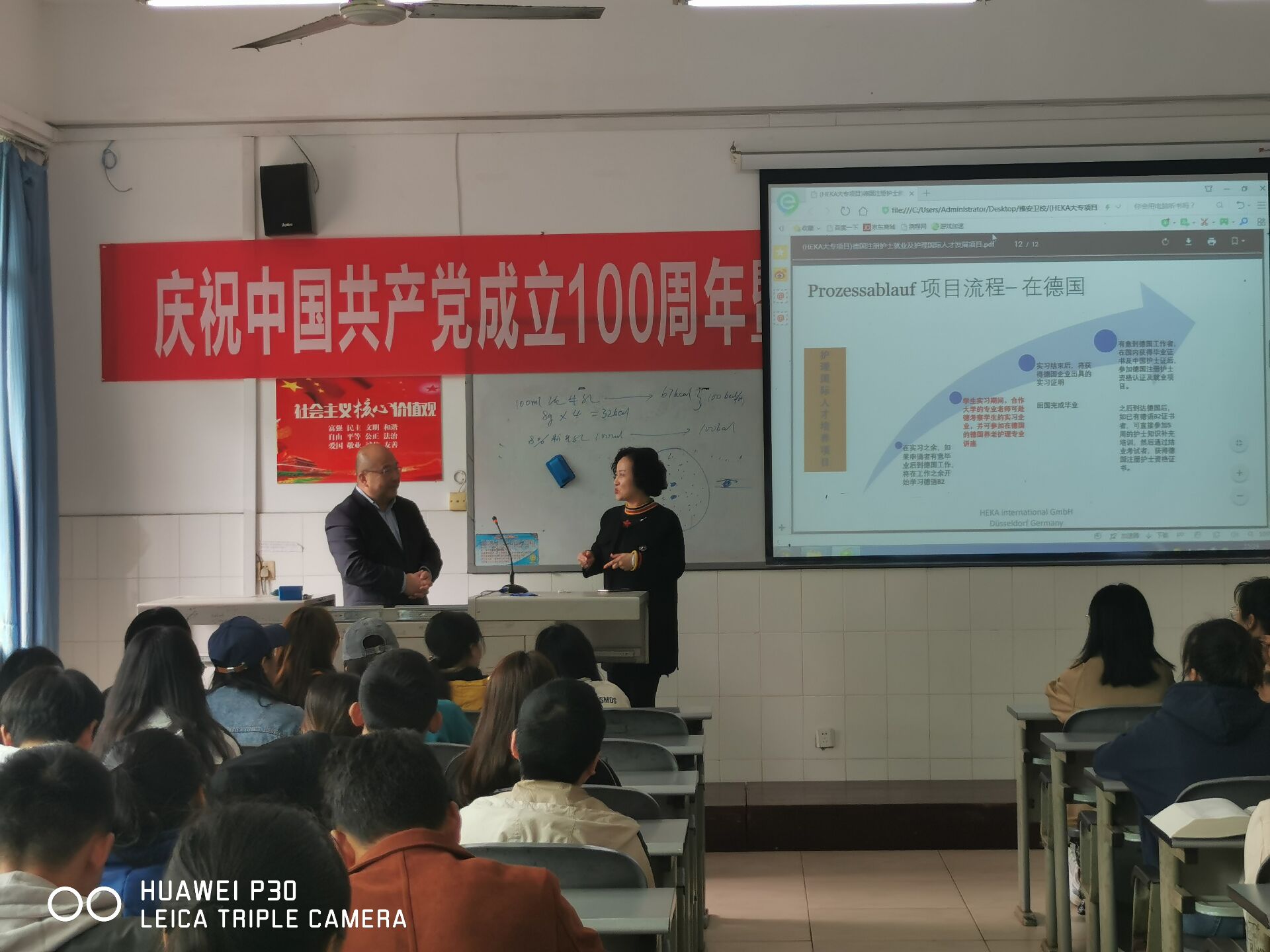 在公司党委的领导和支持下,388vip太阳集团与德国亨嘉国际教育有限公司经过前期的沟通协调,本学期启动了中德护理人才培养项目项目,制定了合作计划书。4月14日下午,公司负责人杨杰和项目负责人唐老师一行来到公司,在育才路校区实验楼101举行了项目启动宣讲会,并组织了2021届护理专业毕业生160余人和辅导员、学管老师参加。