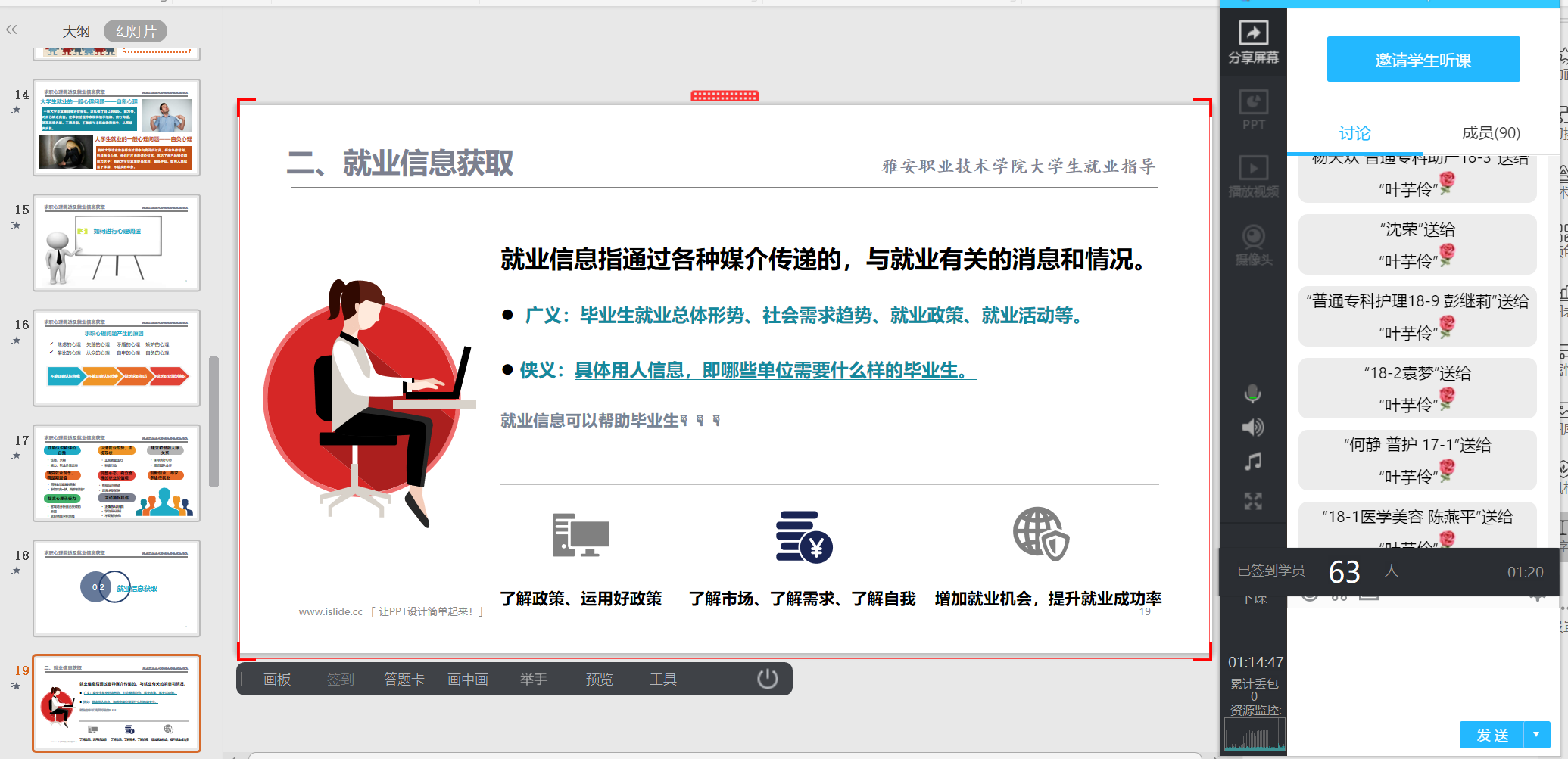3月31日下午,由李燕、叶芋伶、朱学坤、沈丛微主讲的“专升本政策指导与经验分享”、“求职心理调适与就业信息获取”、“云面试技巧”、“简历诊断及指导”4场讲座在腾讯课堂顺利开展,500余名同学通过网络进行了学习。讲座结束后,同学们积极申请加入专题就业指导交流群,继续就求职、升学中存在的问题和老师进行深入讨论和交流。