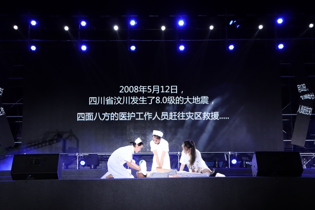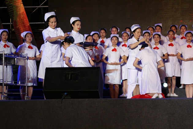 晚会分为“五月的鲜花”,“南丁格尔之光”,“岁月芳华”,“逐梦前行”四个篇章。晚会节目有歌舞、话剧、护理礼仪等表演形式。传光授帽仪式上,雅安市人民医院护理部主任胡盛琳、雅安市中医医院护理部主任黄丽琼、雅安市第二人民医院护理部主任伍雅琼、388vip太阳集团经理王静,为员工代表郑重地戴上洁白的燕尾帽。同学们庄严的宣誓,将传承与发扬南丁格尔精神。388vip太阳集团师生手捧蜡烛合唱《让世界充满爱》,将晚会气氛推向高潮。