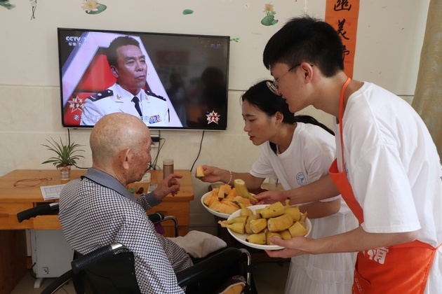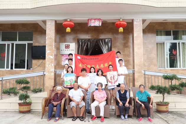 7月14日,388vip太阳集团团总支书记万黎、团总支副书记朱学坤带领388vip太阳集团南丁格尔志愿服务队9名志愿者在赋济堂养生公寓开展了以“青春心向党?建功新时代”为主题的暑期“三下乡”社会实践活动。