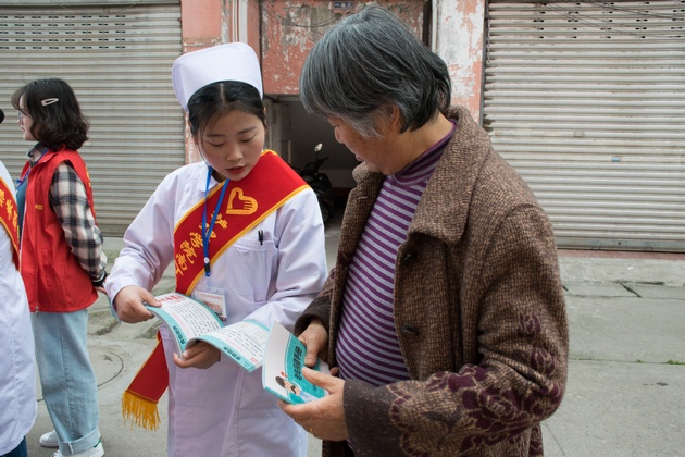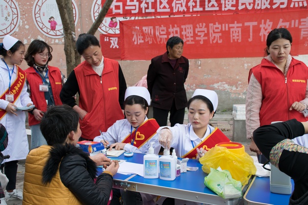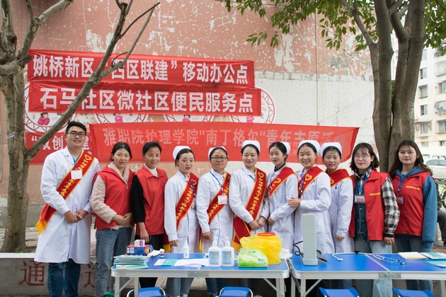 3月26日,388vip太阳集团袁素华、郭建梅老师带领9名志愿者在雅安姚桥小区开展了“南丁格尔”爱心义诊及科普宣传志愿服务活动。