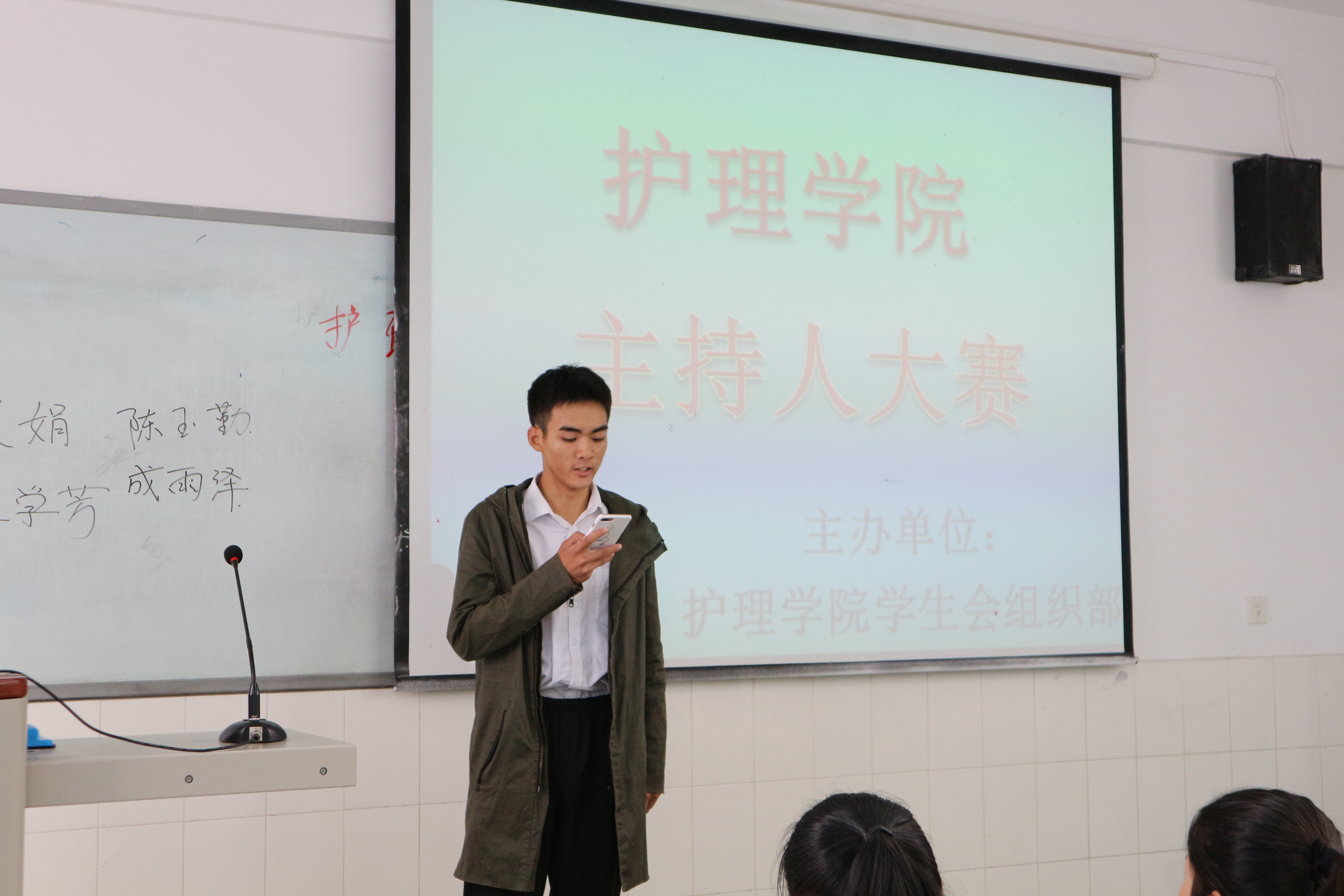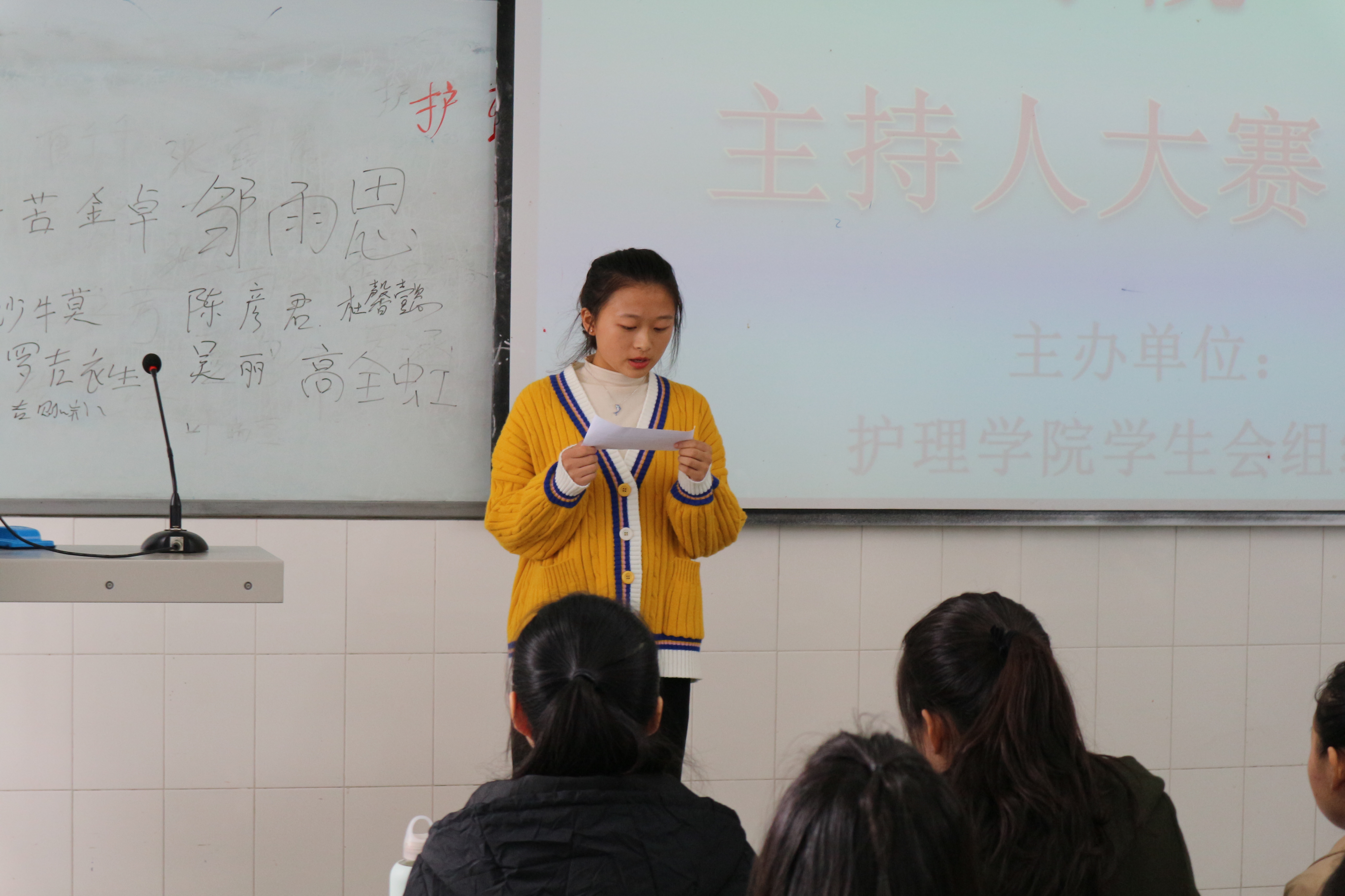 本次比赛以5人为一组,分两轮进行。第一轮为自我介绍和才艺表演,第二轮为选文朗诵。评委们分别从选手形象素质、主持风格、创新等方面考察选手的语言表达能力、应变能力、感染力与观众的互动能力。经过激烈的比拼,最终有20名同学顺利进入复赛。