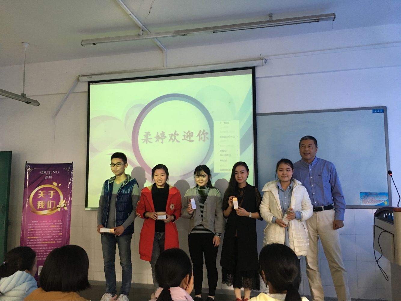 柔婷集团杨总首先介绍了该企业发展历史及规模,柔婷集团是一个集研发、生产、销售、服务为一体的专业美容化妆品集团,自1992年创立至今,全国已有几千家美容连锁机构,在美容行业有着较大影响力。接着,集团孙总以有奖问答形式就该企业就业前景及品牌发展方向跟同学们进行了交流互动,现场一片沸腾,同学们纷纷举手发言并登记了今后发展意愿。