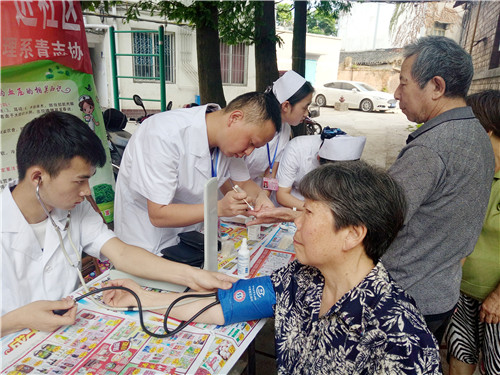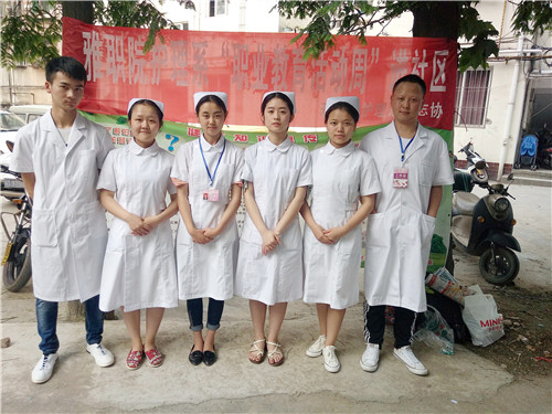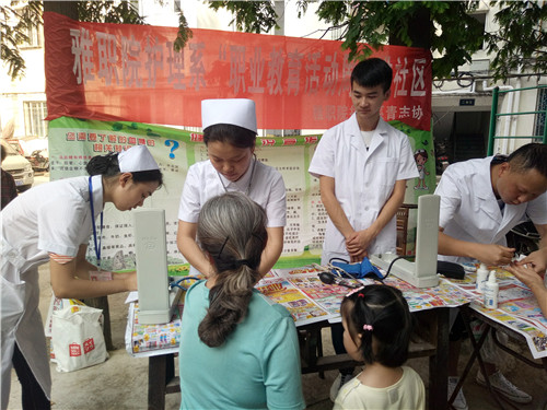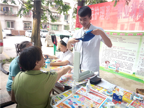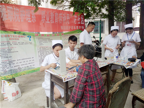 职业教育活动周,关爱温暖进社区。5月11日16:30,388vip太阳集团护理系青志协来到了雅州大道光网智慧小区,开展了“职业教育活动周进社区”的免费义诊活动。
