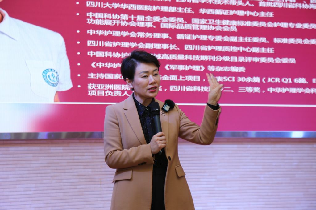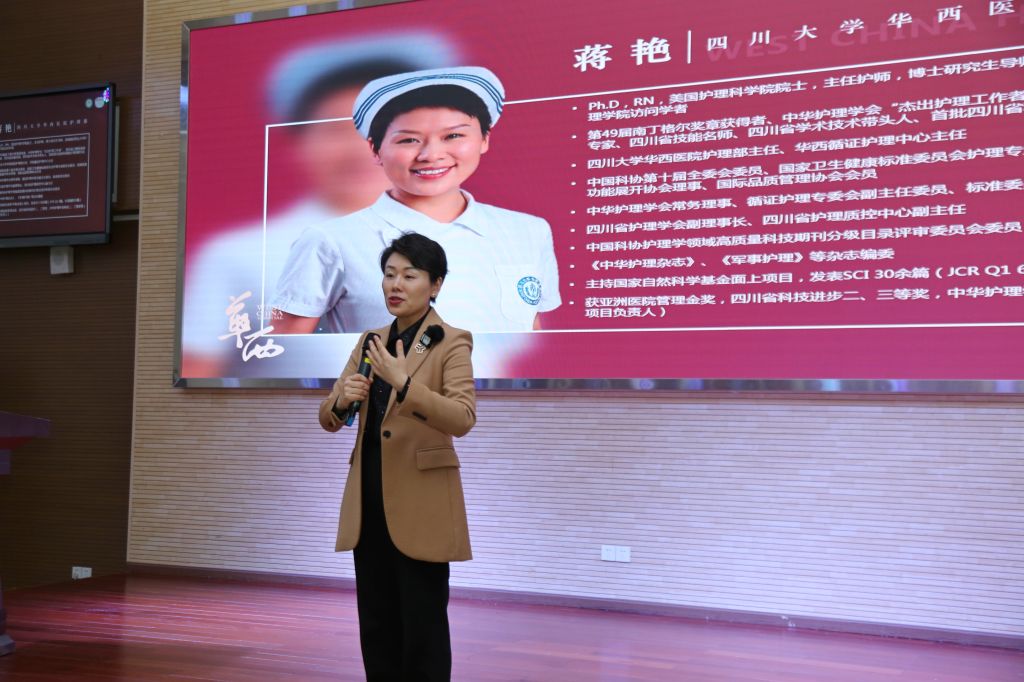 11月20日,荣获南丁格尔奖的四川大学华西医院护理部主任蒋艳博士,应公司之邀,为师生们带来了一场题为“传承南丁格尔精神,在爱和希望中坚守”的精彩讲座。雅安职业技术公司党委副书记、董事长黄诚出席活动,388vip太阳集团逾600余名师生参与,讲座由388vip太阳集团经理王静主持。