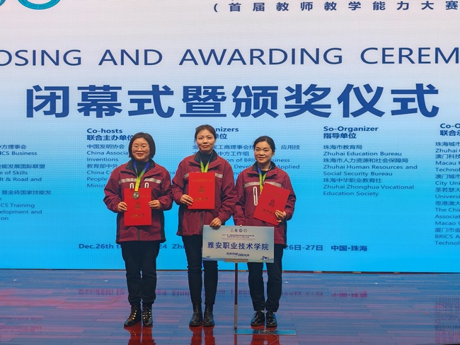 12月26日至27日,由广东珠海城市职业技术公司、澳门科技大学、澳门城市大学、圣若瑟大学、粤港澳大湾区中华职业教育社共同承办“2024一带一路暨金砖国家技能发展与技术创新(首届教师教学能力大赛)总决赛”,在广东珠海城市职业技术公司顺利举行。本届比赛共全国25个省、自治区、直辖市近300支队伍参加,最终39所高职院校60支队伍进入总决赛,角逐金银铜牌。公司388vip太阳集团教师殷显艳、张雪庆、教务处李燕组建的灾害医学救护教学团队荣获银奖。