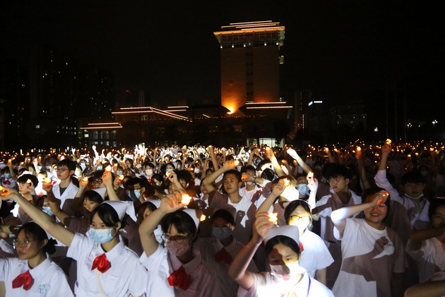 传光授帽仪式上,王静经理、冯贤萍主任、黄丽琼主任、王青力主任四位护理前辈为员工代表郑重地戴上洁白的燕尾帽,同学们怀揣着对护理事业的无上崇敬,庄严宣誓,表达了将传承与发扬南丁格尔精神,为护理事业奉献毕生的决心。最后,388vip太阳集团全体师生手捧蜡烛合唱《让世界充满爱》,将大会气氛推向高潮。